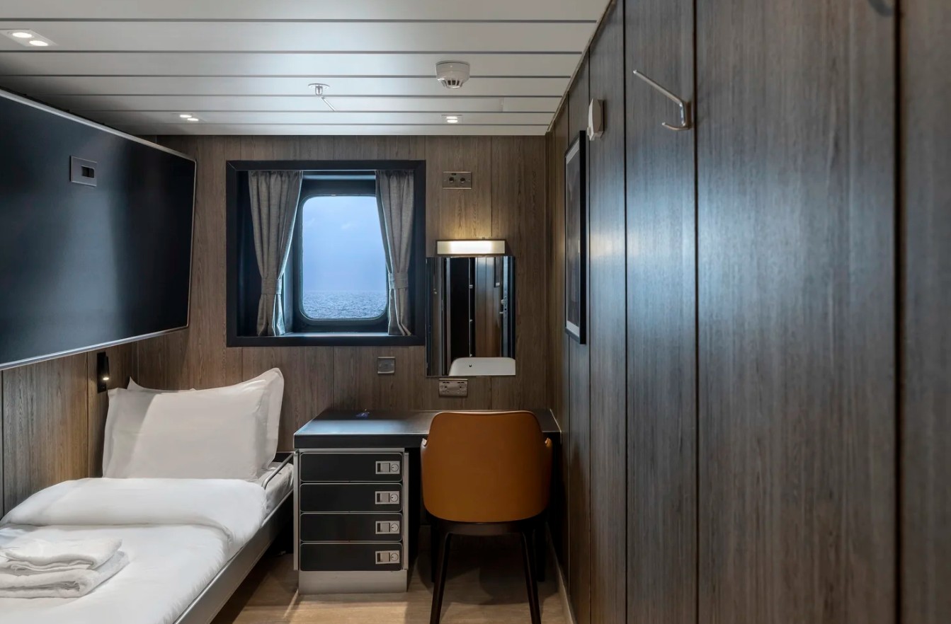 The Superior Cabins located on Deck “A” measure approximately 14 square metres (150 sqft)* and feature a desk, a window, two single beds and an en-suite bathroom.