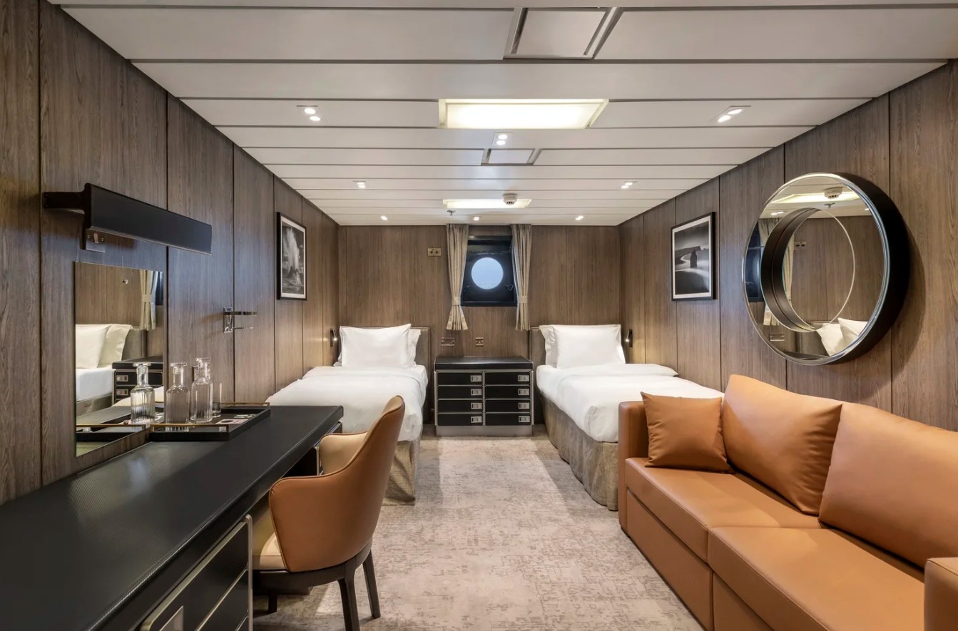 The Deluxe Cabins located on Deck “B” feature a porthole, two single beds and a seating area.